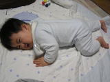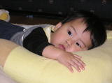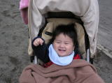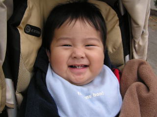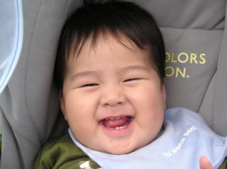 お座りがだいぶしっかりしてきて、 ベビーカーでも寄りかかっているよりは、 背中をつけないで座っているほうがいいみたいです よく右手を外に出してベビーカーに座ってます ベビーカーも途中からB型になりました 前には進まないけど、コロコロよく転がって 部屋中を動き回るようになりました 私によく噛むようになりました 腕とか舐めてるんだけど、そのうちガブッと やるので、歯形がついて痛いです・・・ |